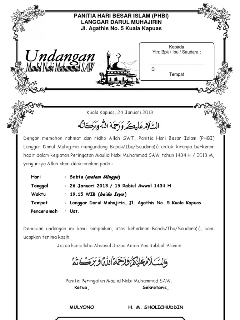 Beberapa diantaranya adalah surat undangan pengajian akbar, pengajian rutin, pengajian pernikahan, pengajian maulid nabi, pengajian umum, pengajian syukuran, dan lain. Karena kita mengingat bahwa nabi muhammad adalah nabi kita semua, umat muslim yang ada di dunia pada zaman ini. Surat undangan adalah sebuah surat yang dikeluarkan baik oleh pribadi maupun lembaga atau perusahaan yang ditujukan kepada pihak yang bersangkutan dengan isi untuk mengundang mereka agar hadir pada acara yang dibuat. Kamu sedang mencari contoh surat undangan acara peringatan maulid nabi muhammad dalam format doc atau word? Tanda tangan dan stempel, pada bagian inilah yang membedakan antara surat resmi dan tidak resmi, pada surat resmi kamu harus bubuhkan tanda tangan dan stempel organisasi atau lembaga.
